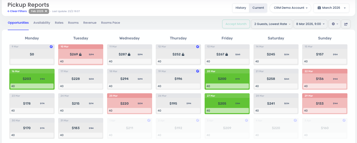 - Opportunities – Displays potential rate changes based on market demand and forecasted performance. Green indicates a rate increase opportunity, and red indicates a recommended decrease.