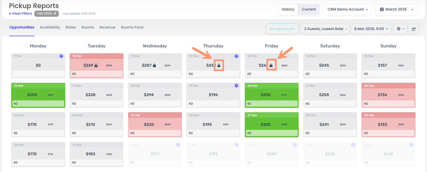 By clicking on a specific date in the Opportunities tab or Pickup Reports, you open the Opportunities Dialog. Here, you can manually override rates or "lock" them to prevent Autopilot from making changes.
