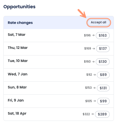 Revenue Intelligence impulsado por Signals ofrece sugerencias de precios en tiempo real, basadas en IA, para ayudarte a capturar más ingresos con menos esfuerzo manual. Esta guía te explica cómo acceder, evaluar y aplicar las Recomendaciones de cambio de tarifa desde la pestaña Oportunidades, incluyendo dónde revisar la explicación detrás de cada recomendación.