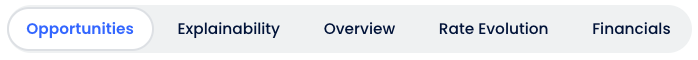 | ⓘ Las pestañas Explicabilidad, Descripción general, Evolución de tarifa y Finanzas no son exclusivas de la sección Cambios de tarifa. También puedes ver esta información desde las vistas detalladas en Informes de pickup. Para más información, visita los artículos de la sección Vista detallada. |
