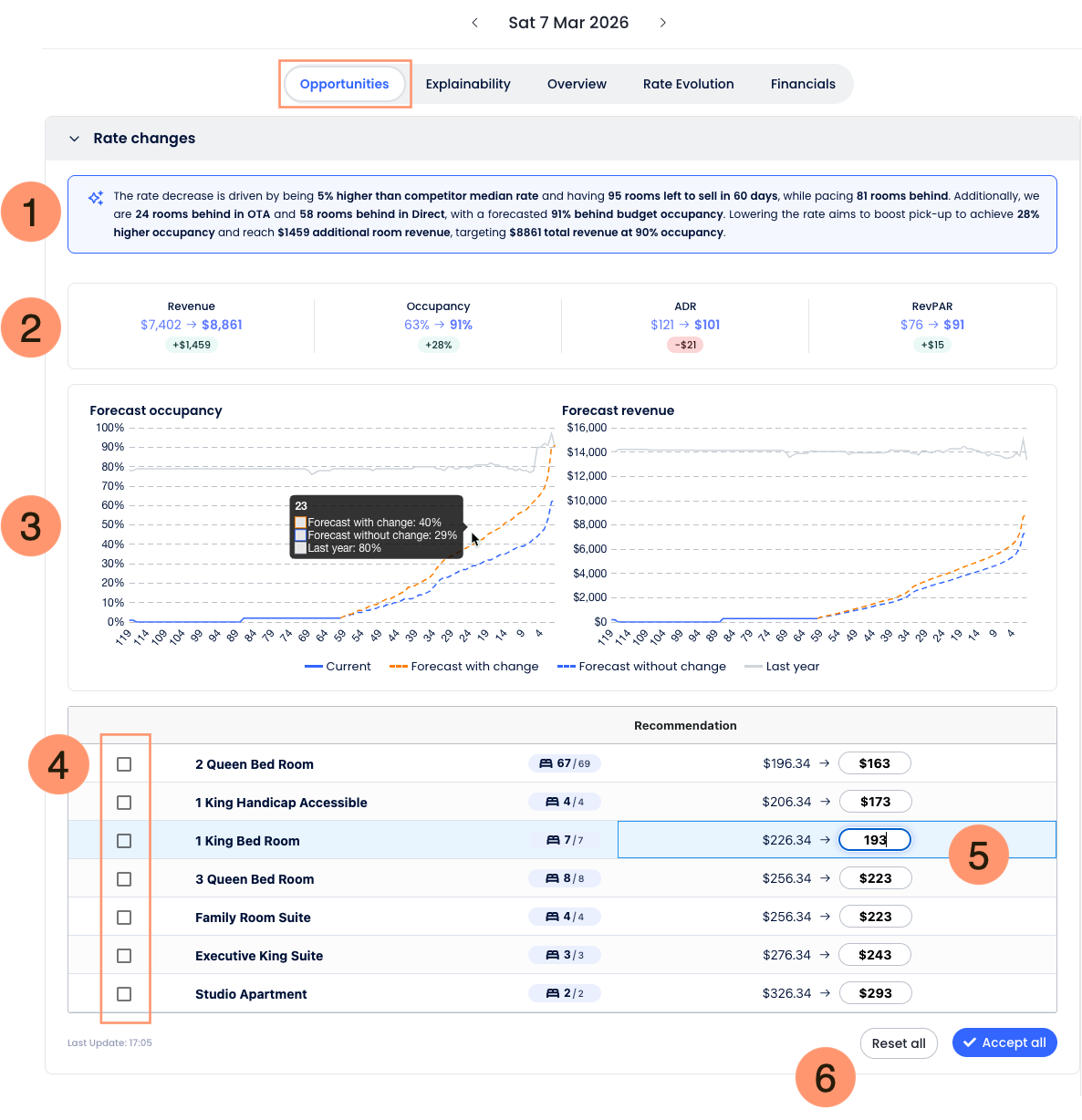 - Oportunidades: Muestra un resumen de alto nivel, en lenguaje sencillo, que explica por qué se recomienda un cambio de tarifa, junto con el impacto proyectado y acciones a nivel de habitación.