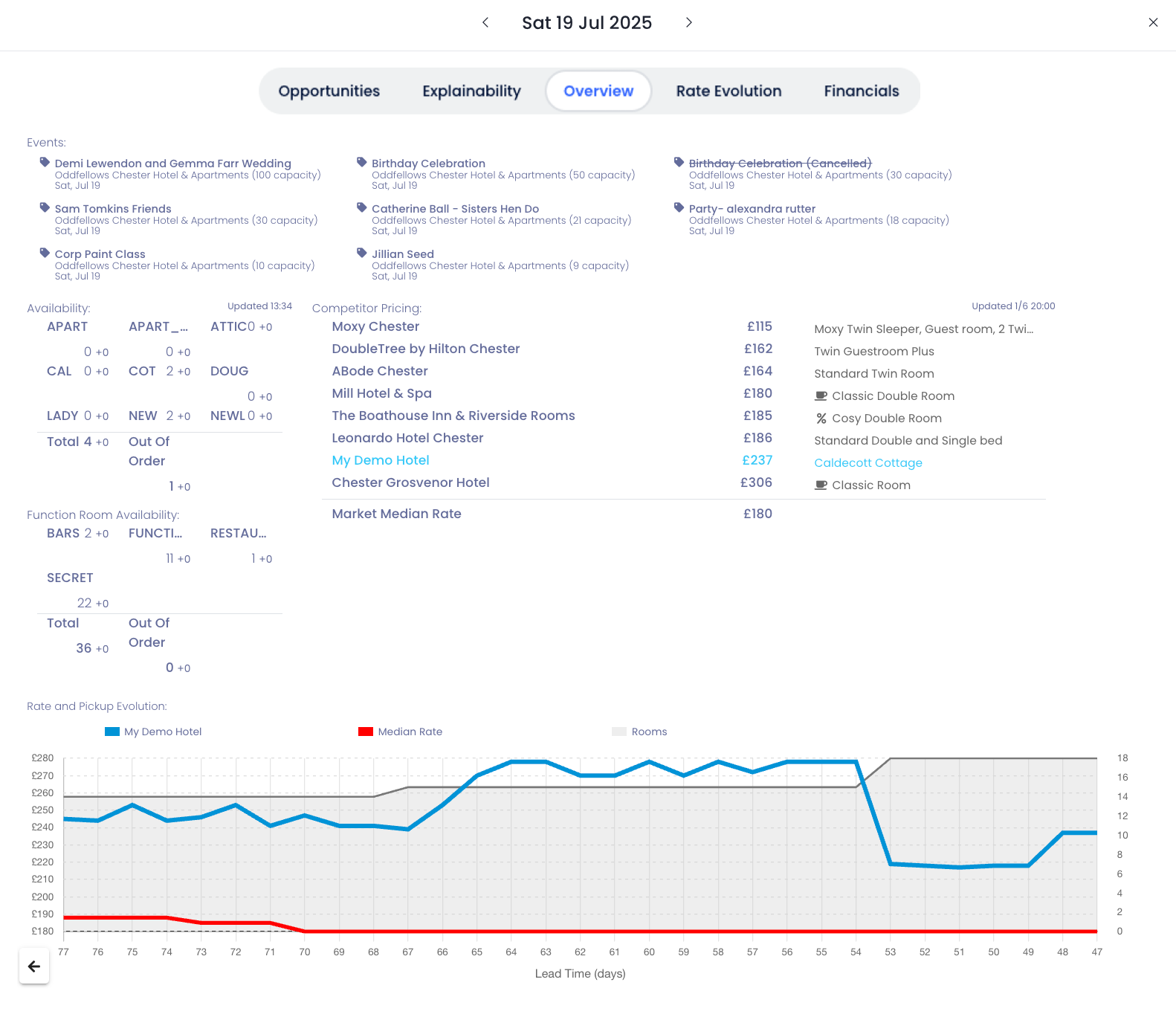 Esto ayuda a las propiedades que organizan eventos o reservas de grupos a entender el uso total del espacio. La disponibilidad limitada de salones puede indicar próximos eventos en la propiedad, lo que refuerza la recomendación de Revenue Intelligence de ajustar las tarifas en consecuencia.