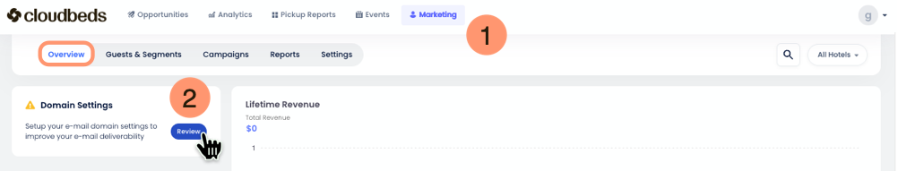 - Asegúrate de haber seleccionado una sola propiedad mediante el Property Picker; la configuración del dominio no puede realizarse mientras esté activa la vista "All Hotels".