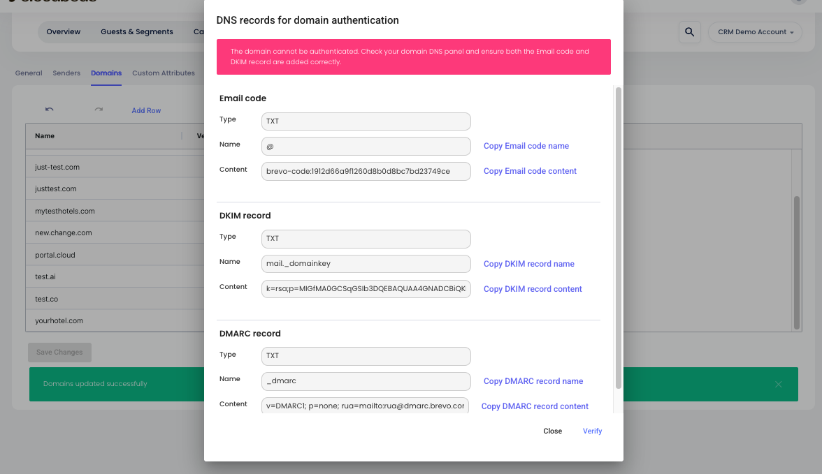 Después de agregar tu dominio en Marketing > Settings > Domains, haz clic en Verify. Aparecerá una ventana emergente con el Name y el Content necesarios para cada registro.