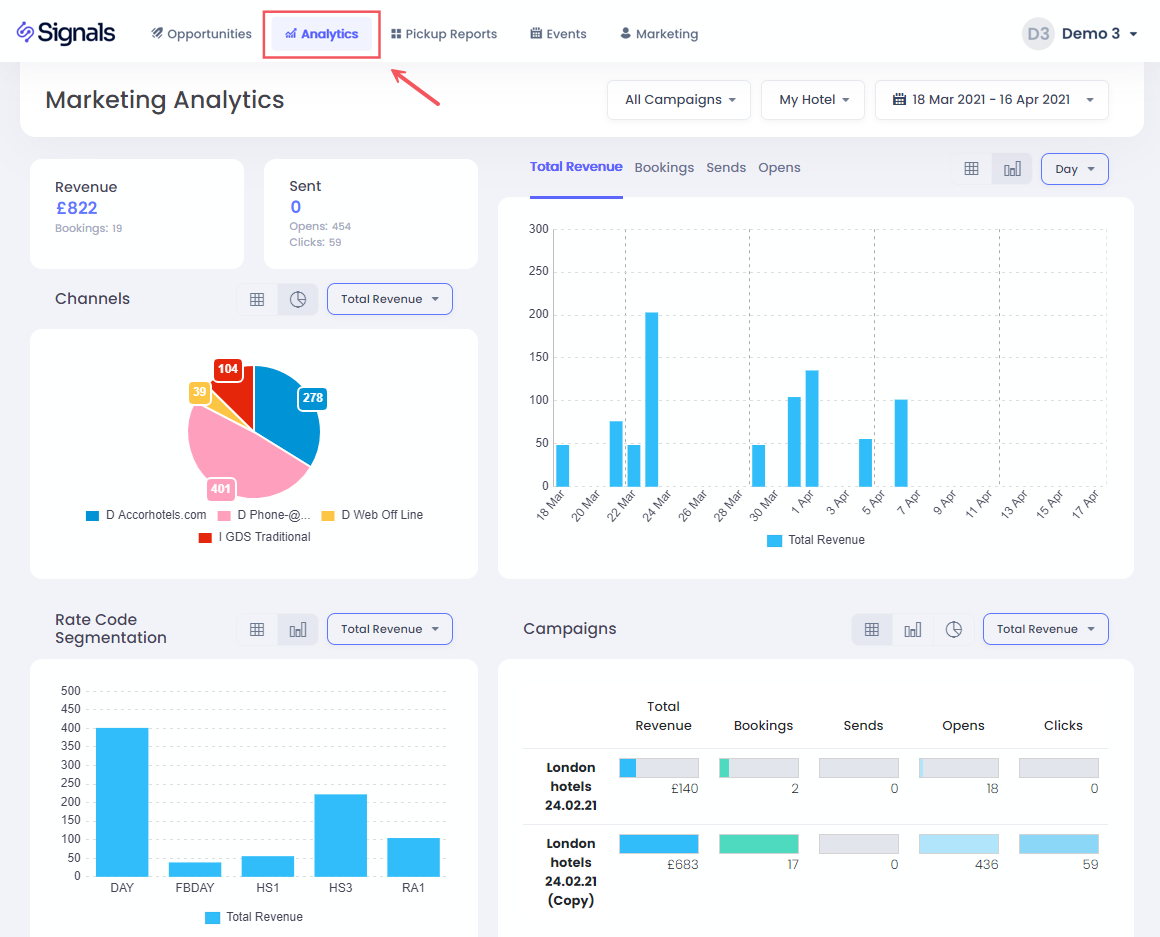 Aqui você pode encontrar a Receita de reservas total, número de reservas, e-mails enviados, abertos e totais de cliques para o intervalo de datas selecionado