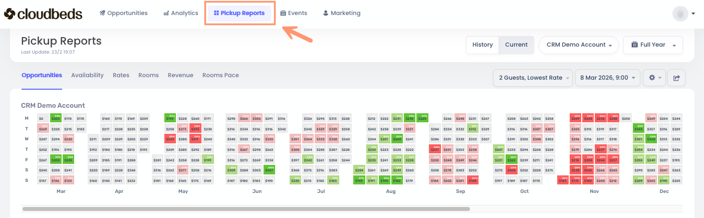 A seção Relatórios de Pickup constitui a parte principal de sua jornada para entender a posição atual do seu hotel. A página inicial oferece uma visão geral do ano em vários hotéis do seu portfólio.