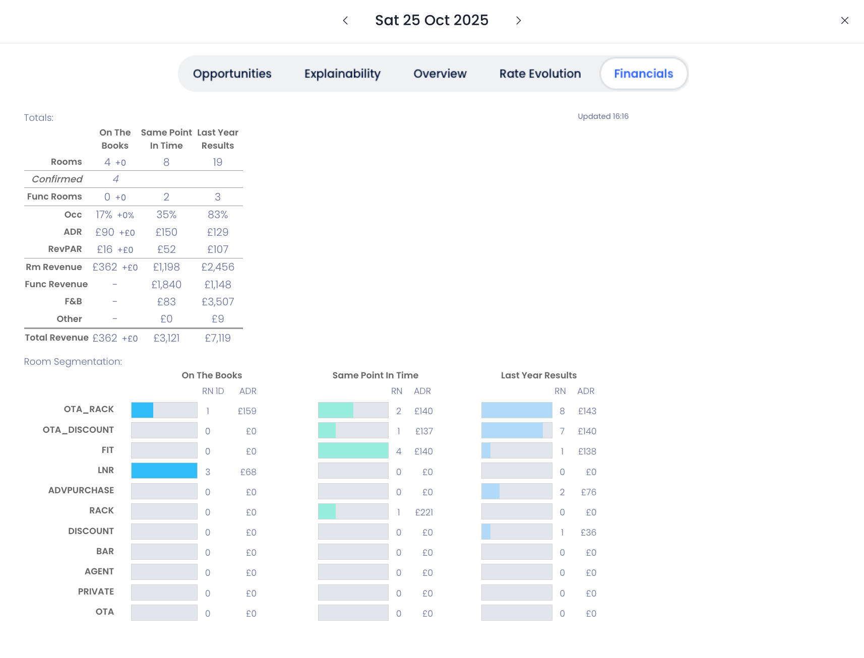 A guia Finanças ajuda você a avaliar o impacto das recomendações do Revenue Intelligence no desempenho, comparando os dados atuais com benchmarks anteriores e da concorrência. Essa seção combina métricas e dados de segmentação de salas para fornecer um resumo e uma análise detalhada.