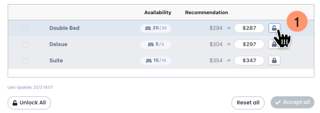 Desbloqueio: Para devolver uma tarifa ao gerenciamento do Autopilot, clique no ícone de cadeado ao lado do tipo de acomodação bloqueado e confirme que deseja desbloquear. O ícone de cadeado desaparecerá e o tipo de acomodação não estará mais acinzentado, indicando que a tarifa está novamente elegível para atualizações automáticas do sistema.