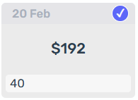 Na visualização do calendário do Relatórios de Pickup, essas tarifas manuais são identificadas por uma marca de seleção em laranja, indicando que uma tarifa personalizada foi aplicada em vez da recomendada pelo sistema (que usa uma marca de seleção em azul).