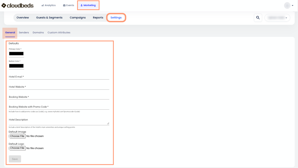 Agora que seu domínio está seguro, certifique-se de que suas Configurações de Marketing estejam completas. A guia Geral é onde você define a marca principal da sua propriedade, incluindo cores da marca, descrição do hotel, logotipo e links diretos para o site.