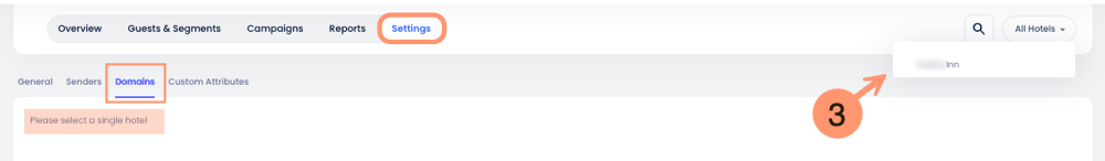 - Certifique-se de ter selecionado uma única propriedade usando o Seletor de Propriedade; as configurações de domínio não podem ser configuradas enquanto a visualização "Todos os Hotéis" estiver ativa;
