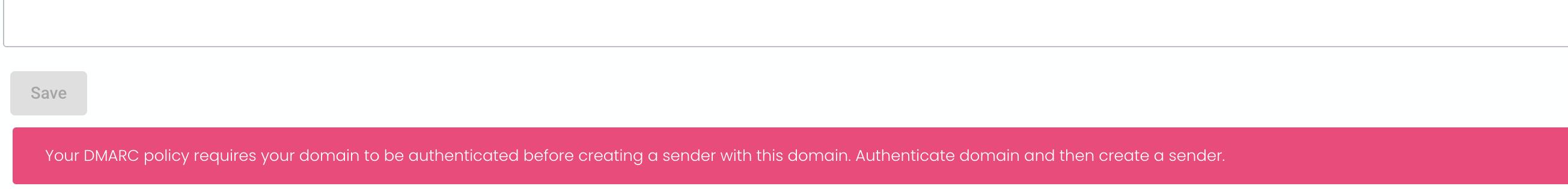 Você deve completar o processo de autenticação do domínio antes que o sistema permita adicionar um novo endereço de e-mail remetente. Clique na imagem para ampliá-la. |