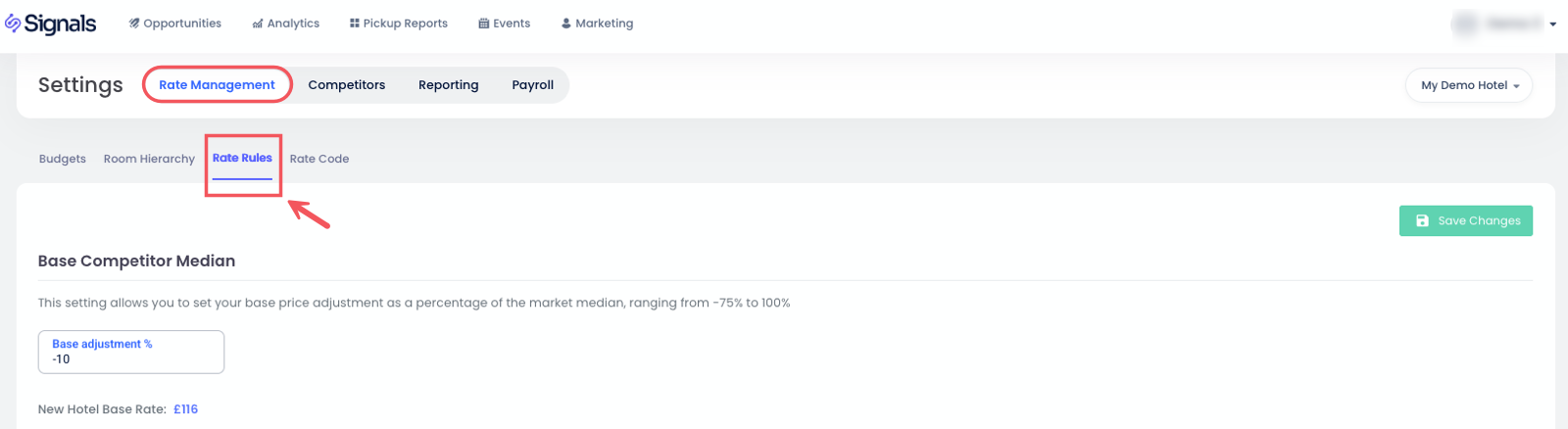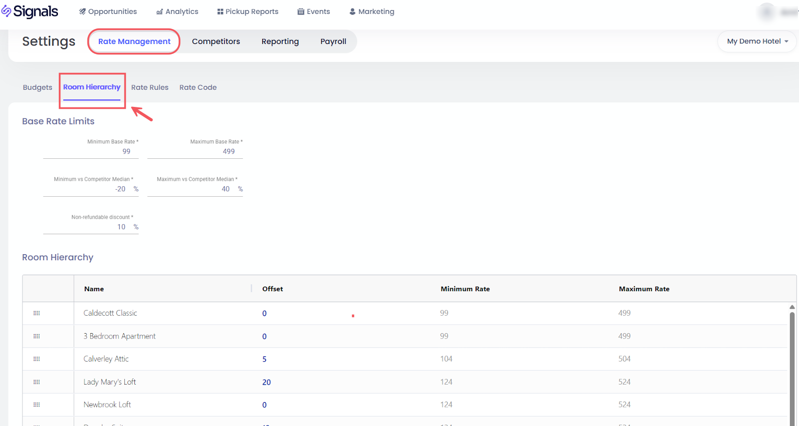 - ลำดับชั้นห้อง: กำหนด ขีดจำกัดอัตรามาตรฐาน และการป้องกันที่สัมพันธ์กับค่ากลางของคู่แข่ง กำหนดอัตราขั้นต่ำ/สูงสุดและการปรับเปลี่ยนต่อประเภทห้อง