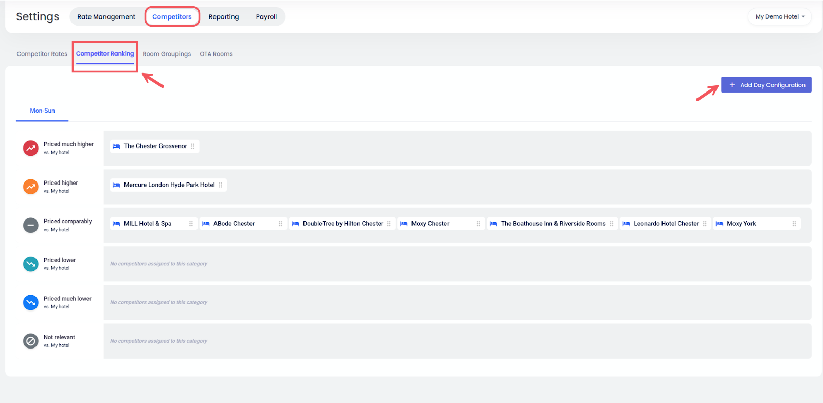 - การจัดอันดับคู่แข่ง: กำหนดน้ำหนักให้คู่แข่งว่า “ตั้งราคาไว้สูงกว่า” “ตั้งราคาไว้ต่ำกว่า” หรือ “ตั้งราคาไว้เทียบเท่า” คุณยังสามารถสร้าง การกำหนดค่าตามวัน เพื่อใช้การจัดอันดับคู่แข่งที่แตกต่างกันในวันเฉพาะของสัปดาห์