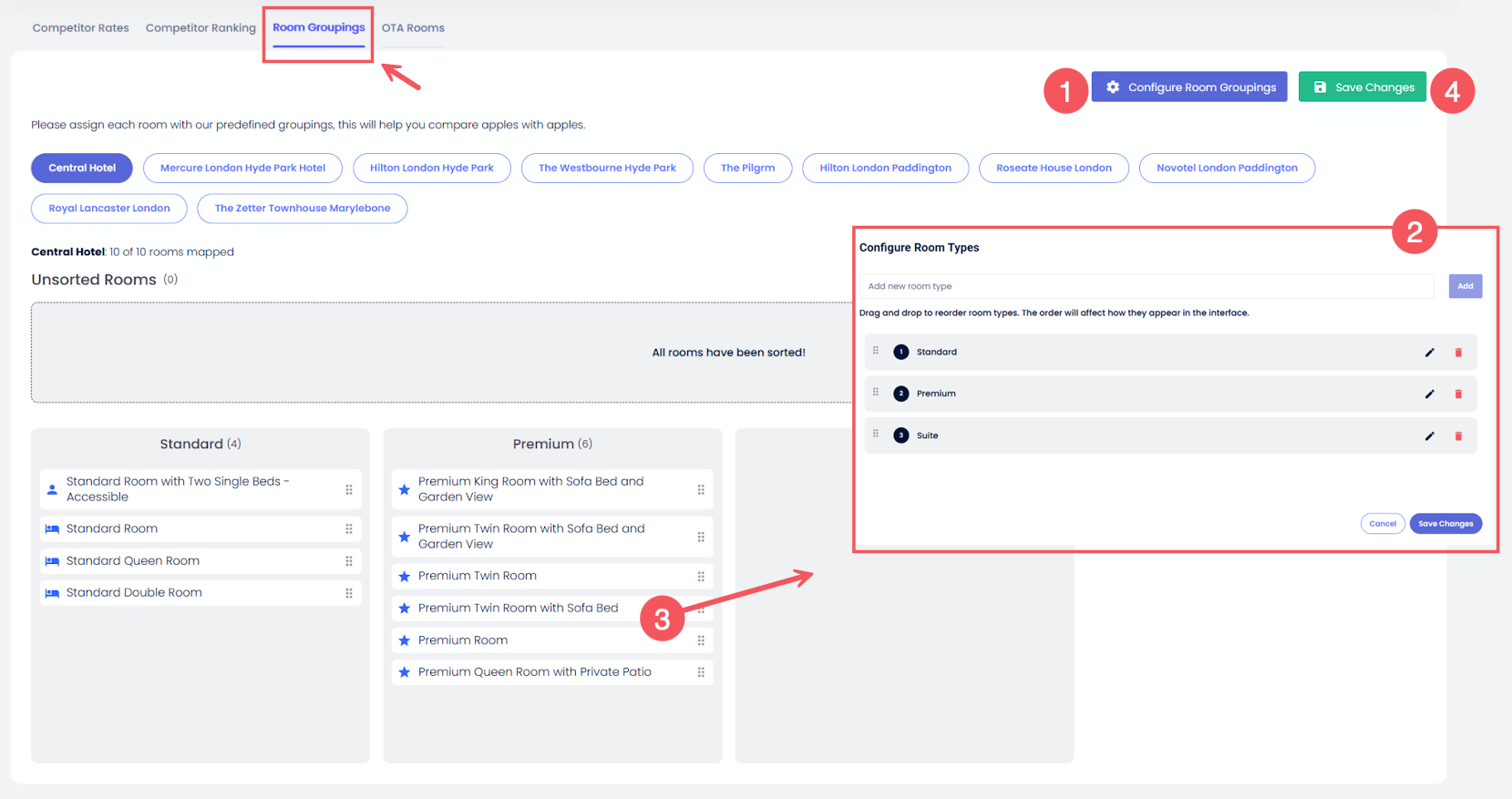 - การจัดกลุ่มห้อง: แม็ปประเภทห้องของคุณเองและประเภทห้องของคู่แข่งไปยังหมวดหมู่มาตรฐาน พรีเมียม และสวีท เพื่อให้สามารถเปรียบเทียบ “แอปเปิ้ลกับแอปเปิ้ล” ได้