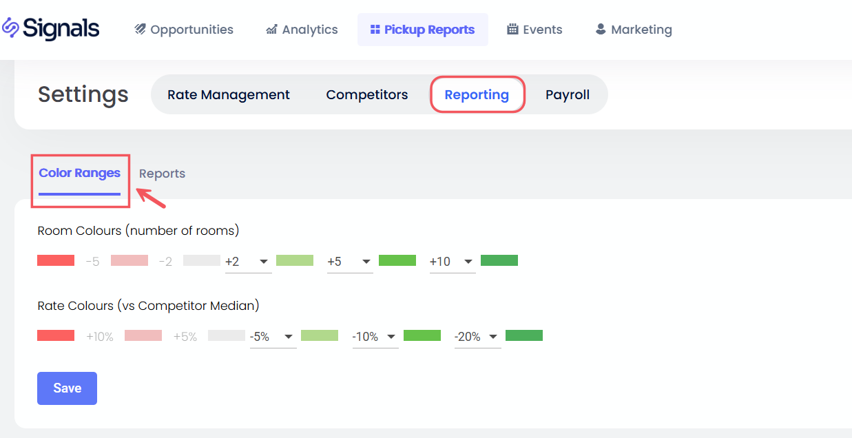 ช่วงสี: ปรับแต่งเกณฑ์สำหรับ รายงานการรับ การจัดสี กำหนดทั้ง สีห้อง (จำนวนห้องที่แตกต่างกัน) และ สีอัตรา (เปอร์เซ็นต์ที่แตกต่างกันเมื่อเทียบกับค่ากลางของคู่แข่ง)
