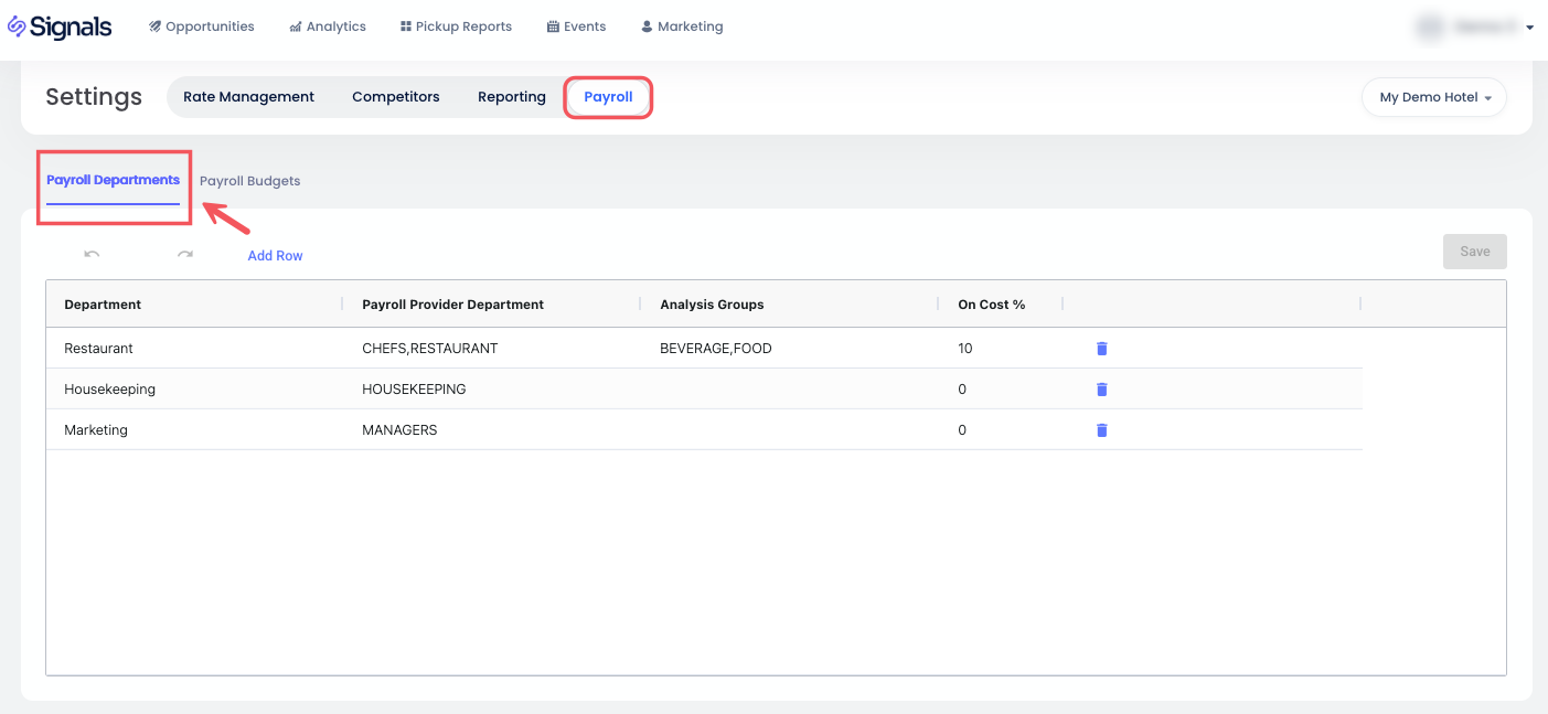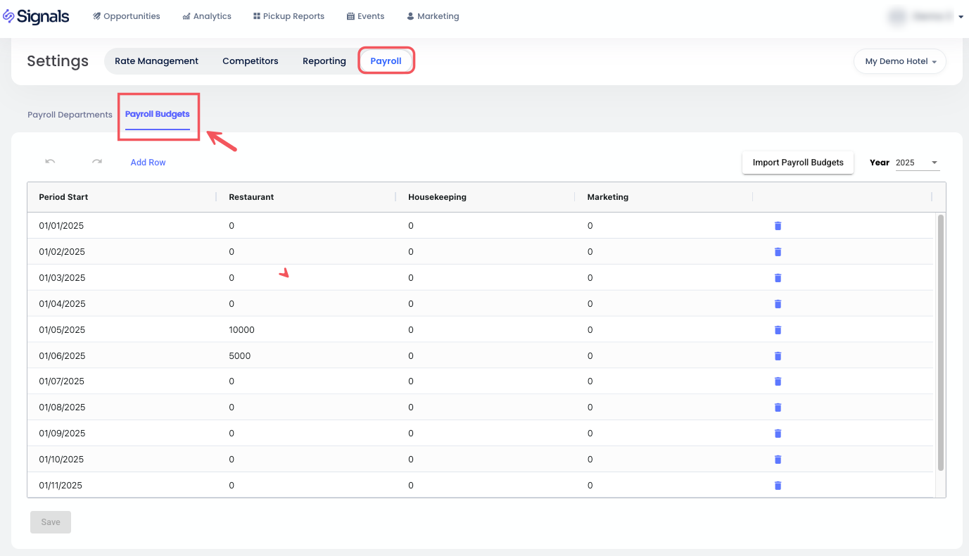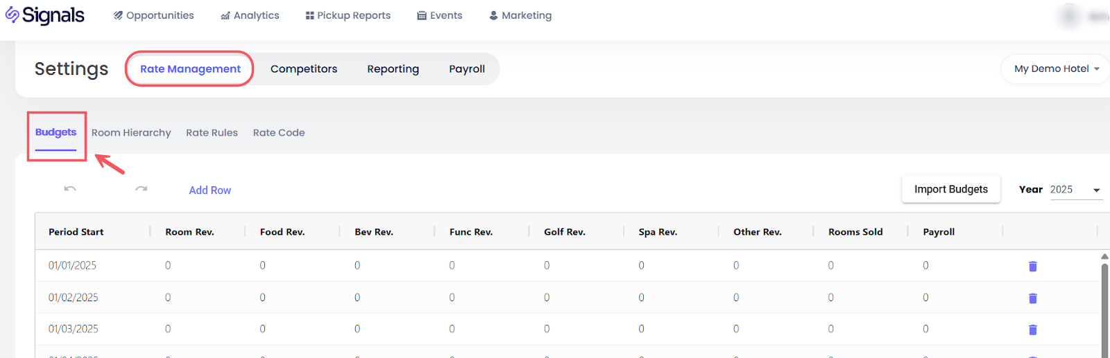 งบประมาณ: ป้อนงบประมาณสำหรับรายได้จากค่าห้อง รายได้จากอาหารและเครื่องดื่ม รายได้อื่นๆ และ ห้องที่ขายได้ เกณฑ์มาตรฐานเหล่านี้จะถูกใช้ในวิเคราะห์และช่วยในการกำหนดกลยุทธ์การกำหนดราคา งบประมาณสามารถกำหนดได้ด้วยตนเองหรือส่งออกผ่าน CSV.