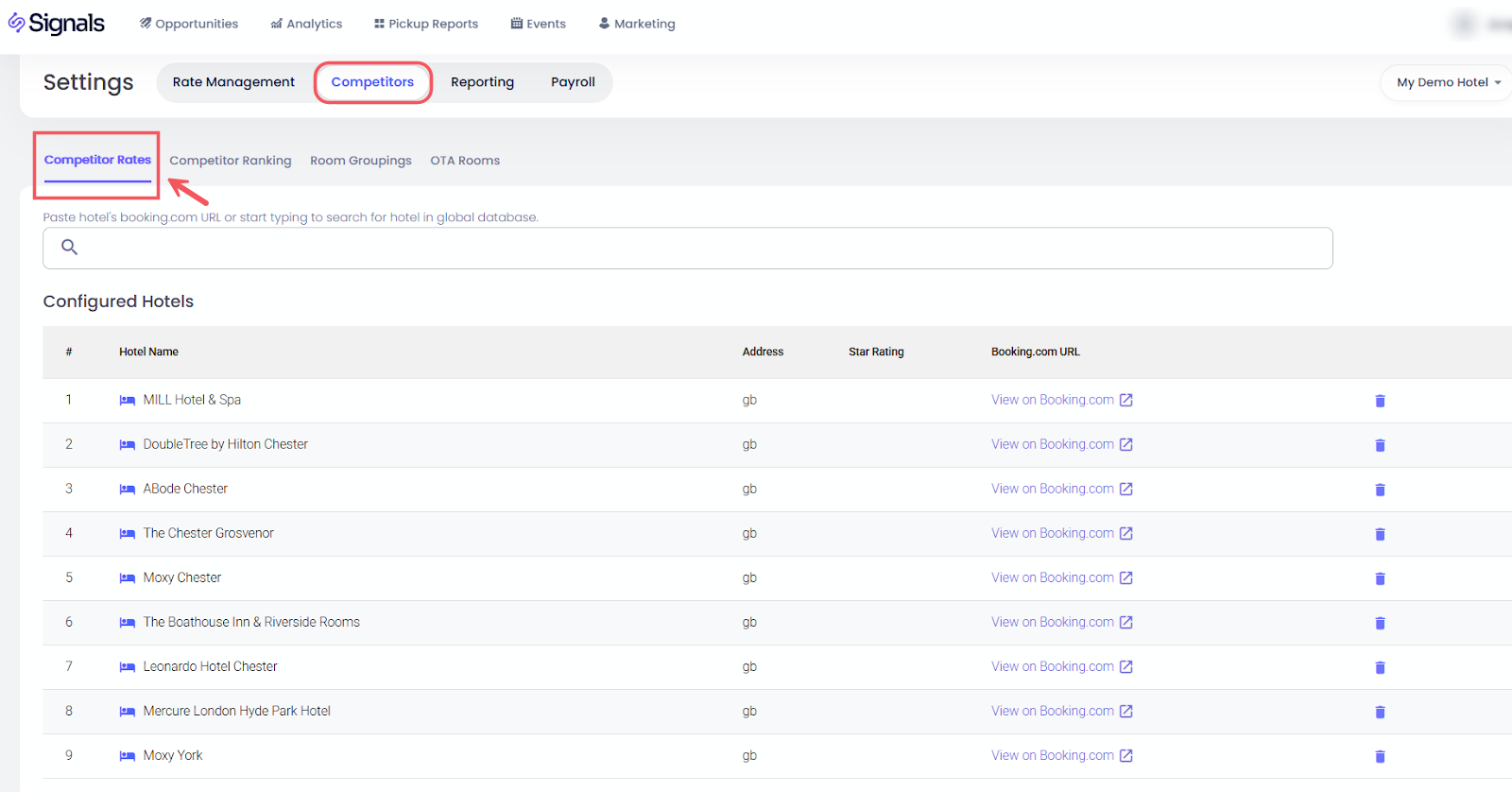 อัตราคู่แข่ง: เพิ่มคู่แข่งโดยตรงในแพลตฟอร์มโดยการค้นหาหรือวาง URL ของ Booking.com ระบบจะตรวจสอบและดึงข้อมูลอัตรา