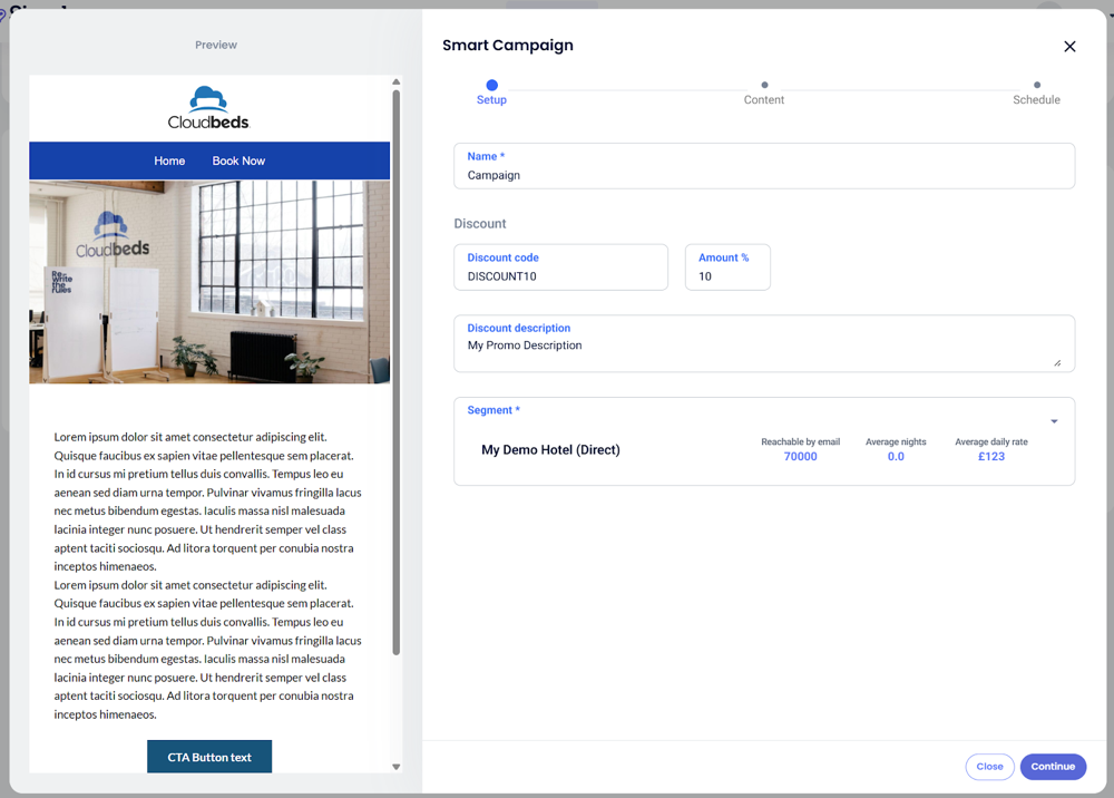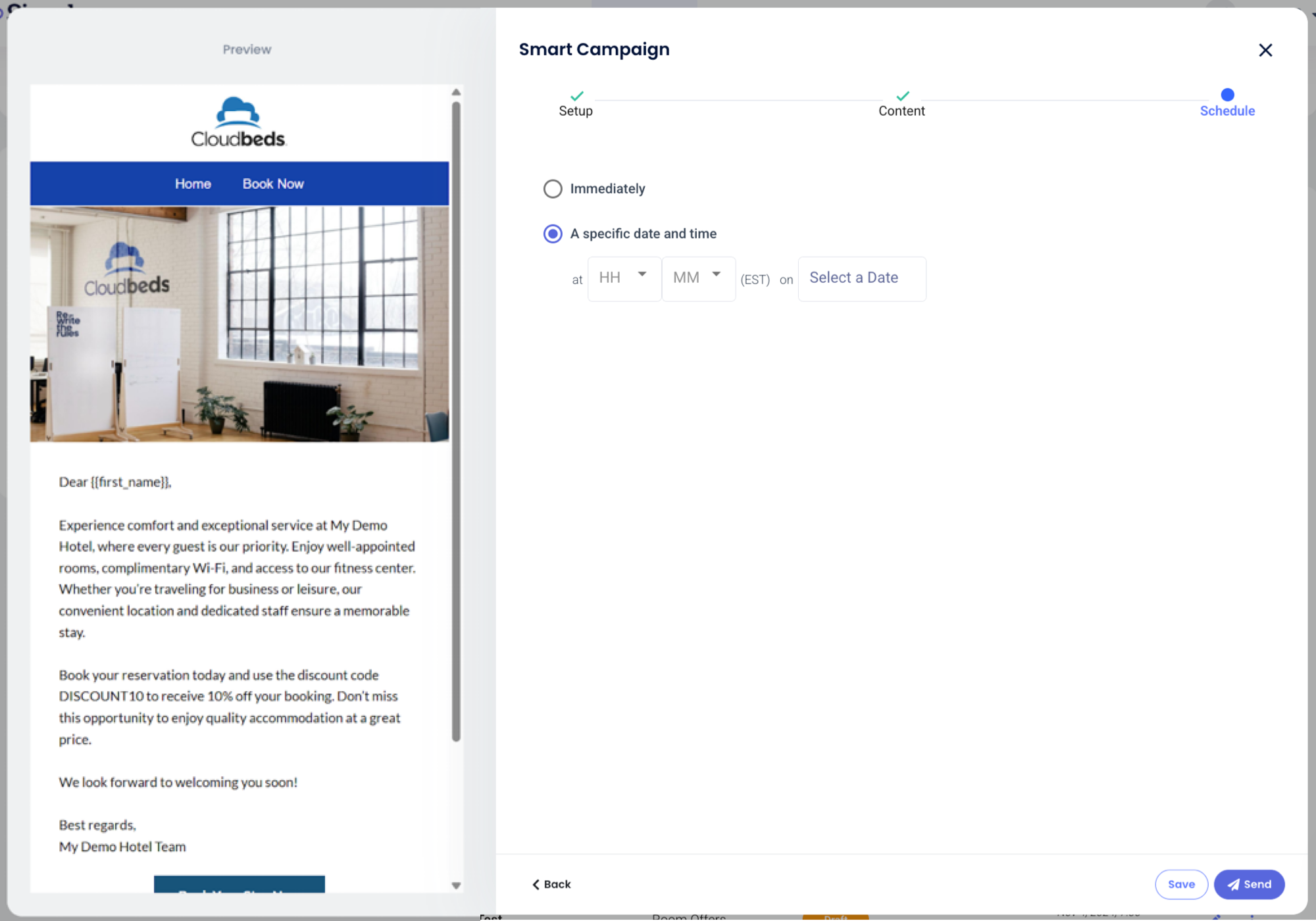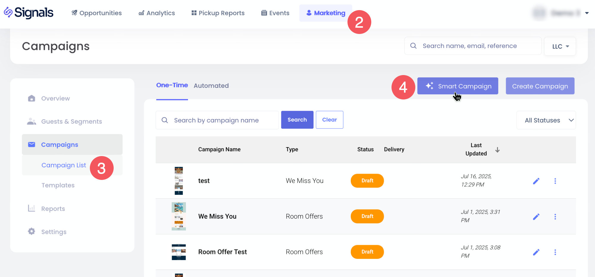 Smart Campaigns เป็นแคมเปญอีเมลที่ใช้ประโยชน์จากปัญญาประดิษฐ์เพื่อปรับปรุงโดยอัตโนมัติตามกลุ่มผู้เข้าพักและข้อมูลทั่วไปที่คุณกำหนดไว้ใน การตั้งค่าการตลาด